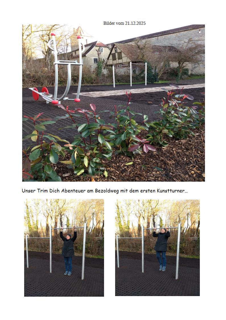 ** Aktuelles ** - Siehe neue Fotos aller Beiräte unter "Wir stellen uns vor"! - Fitness am "Bezoldweg" Bodenarbeiten, Fotos: 08.10. BildA + BildB 11.12. BildC, aktuell 21.12. BildD - Der "Bürgerbus Region Rothenburg" kommt. Die umliegenden Gemeinden warten jetzt auf den Förderbescheid. - Alle Sitzungen des Seniorenbeirats sind öffentlich. Nehmen Sie unverbindlich teil! Nächstes am Mittwoch, den 14. Januar ab 16:30 Uhr im Restaurant "Hallenbad", die Tagesordnung steht dann rechtzeitig unter "Informationen". - Dem Seniorenbeirat können Sie eine Nachricht schreiben unter "Kontakt" oder uns per Telefon 📞 ansprechen! Der Seniorenbeirat wünscht Ihnen gute Gesundheit, Glück und Freude, Mut und Gelassenheit! Genießen Sie täglich aktiv den wechselhaften den beginnenden Winter! ▶️Hier unser neuester Flyer! |